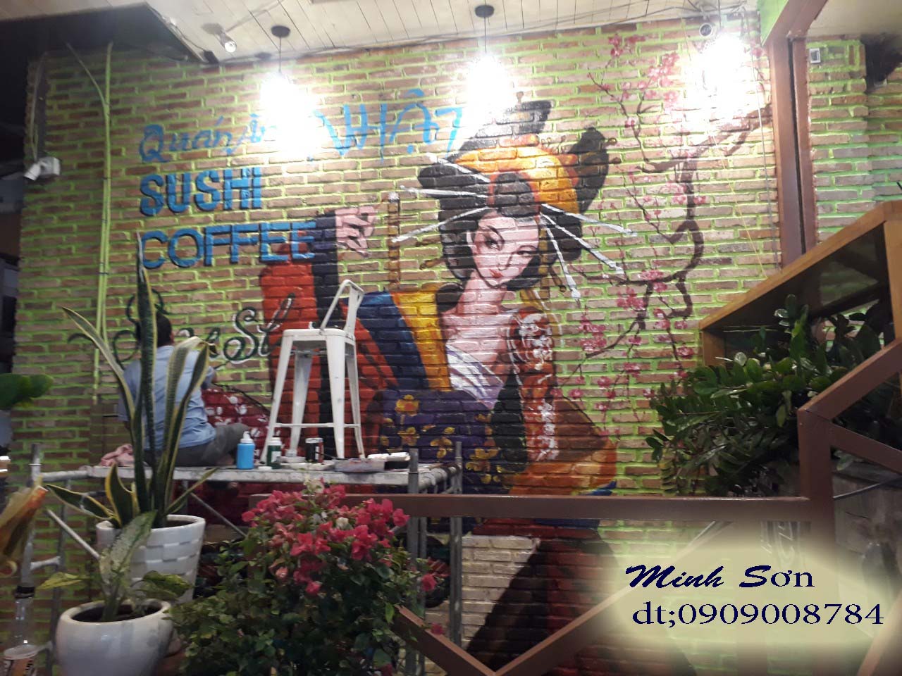 vẽ cô gái nhật trang trí quán ăn sushi và cafe